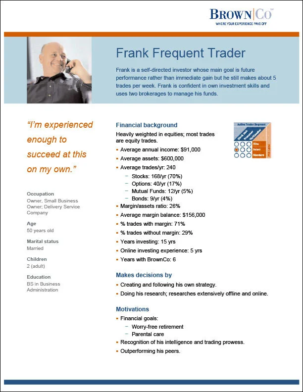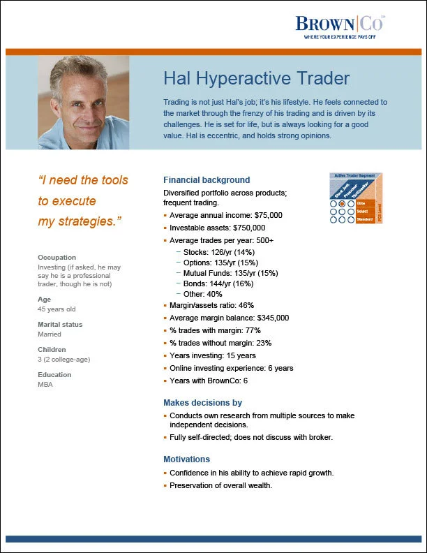 Redesigned the web site to better meet the needs of the serious, experienced and active trader. Created a fast, streamlined, easy-to-use site to provide the active trader maximum control over their online trading experience, and position BrownCo as a leader within the competitive landscape. Started the effort with a mind mapping exercise to align stakeholders on what was most important to the customer and the brand. Helped to create and design abbreviated and comprehensive personas to enable a well-targeted site design that best meets the needs of customers.