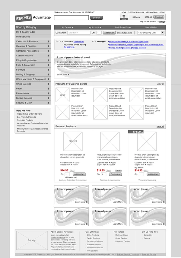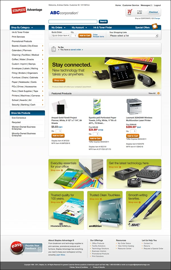 Provided creative and user experience leadership to the redesign of the Staples Advantage eCommerce site. Directed a team of user experience professionals and visual designers through contributing to requirements gathering, wireframe creation, usability test prototyping, visual design and style guide documentation. Key goals included delivering an improved search and browse experience while evolving the design to engage users and align with brand standards.