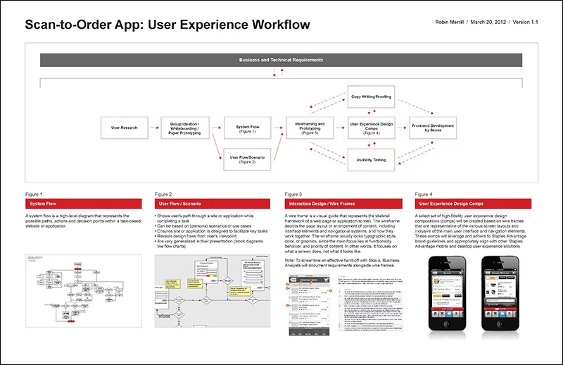 Created a user experience workflow diagram that served to align the business, IT and an external development vendor on the process of creating a mobile ordering application.
